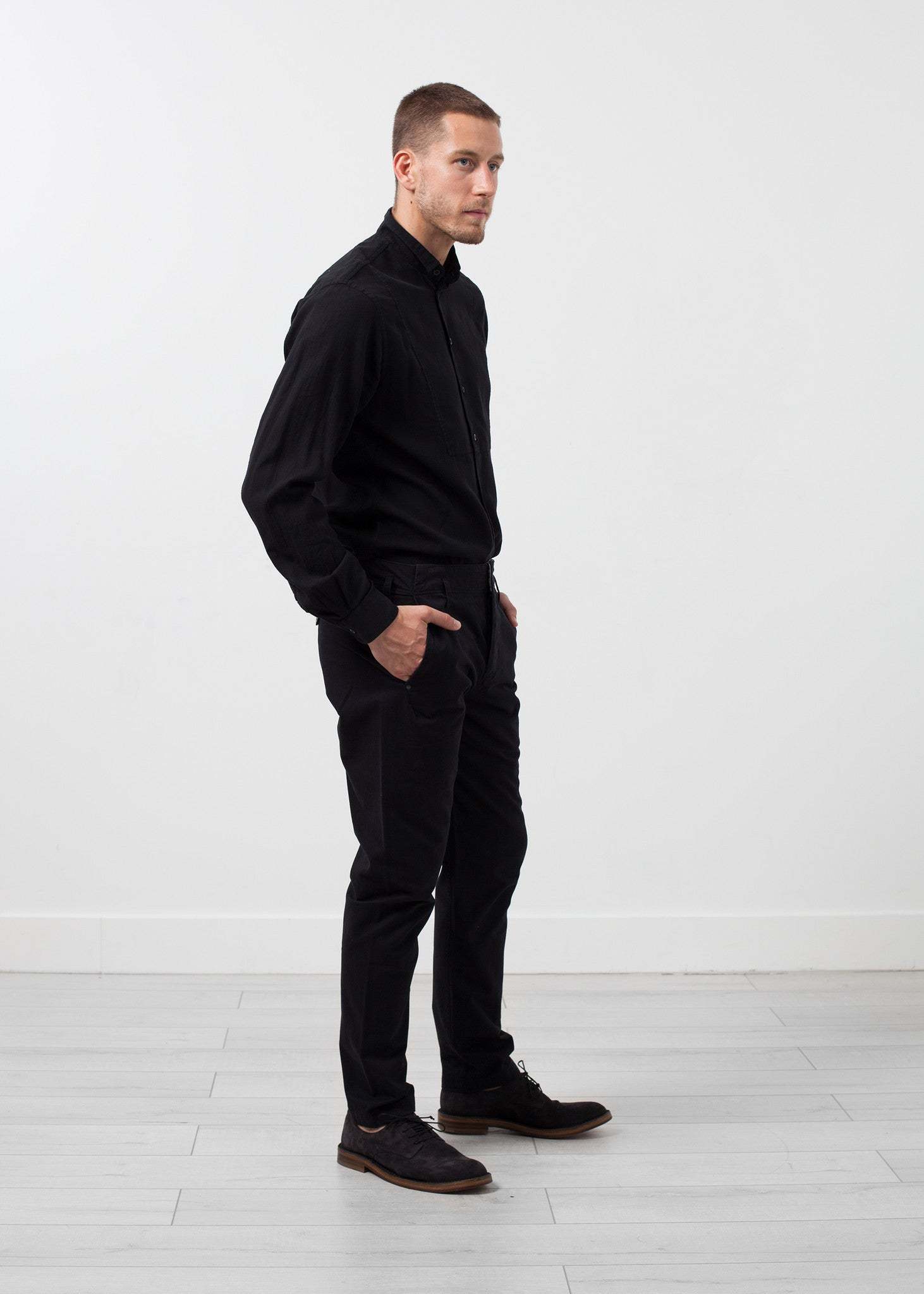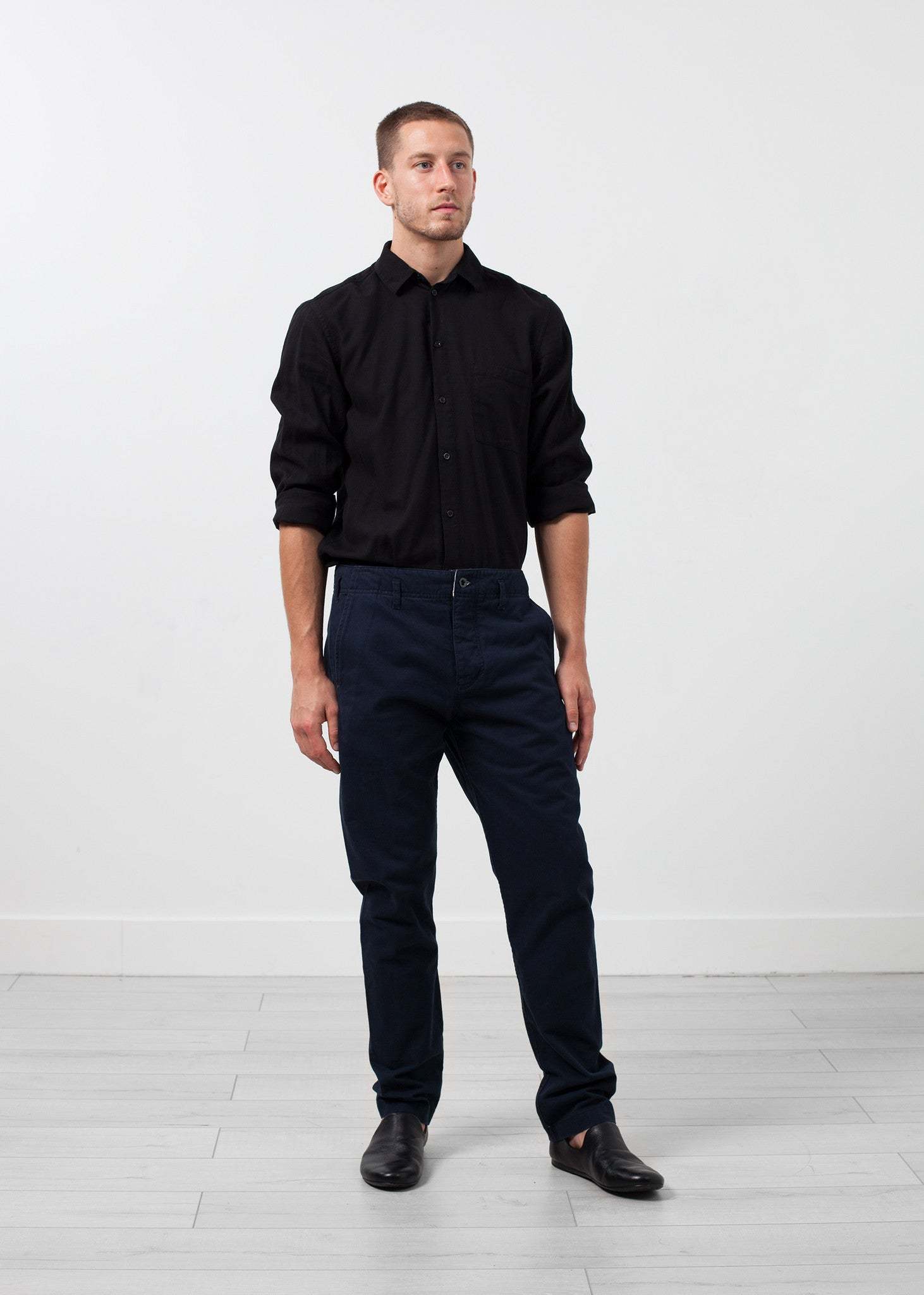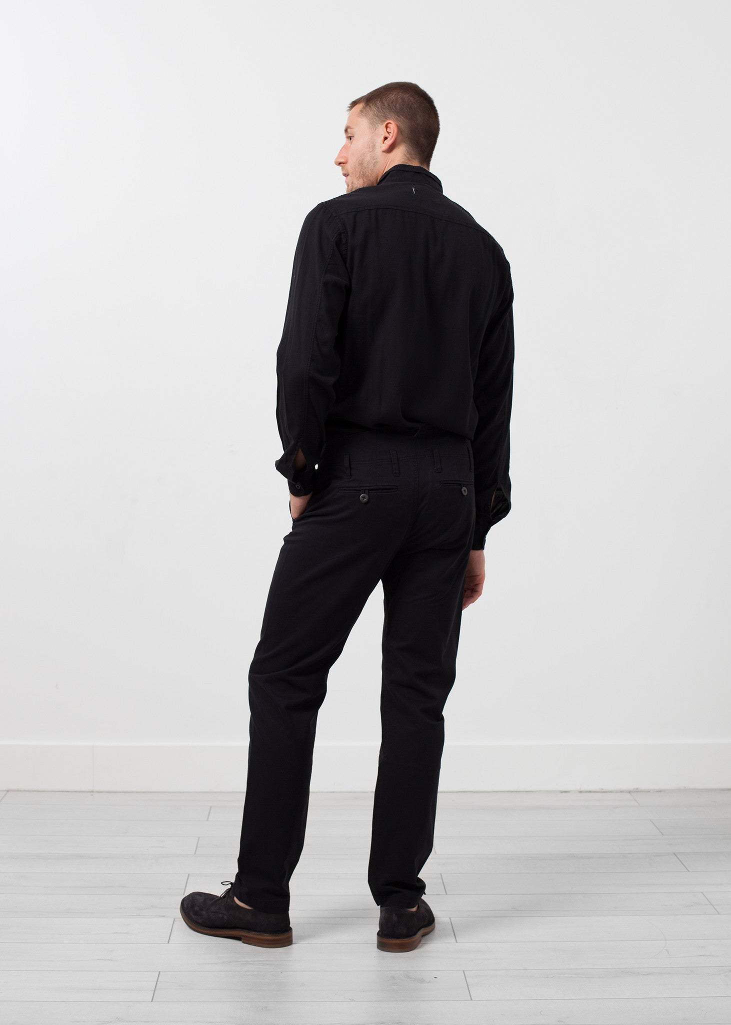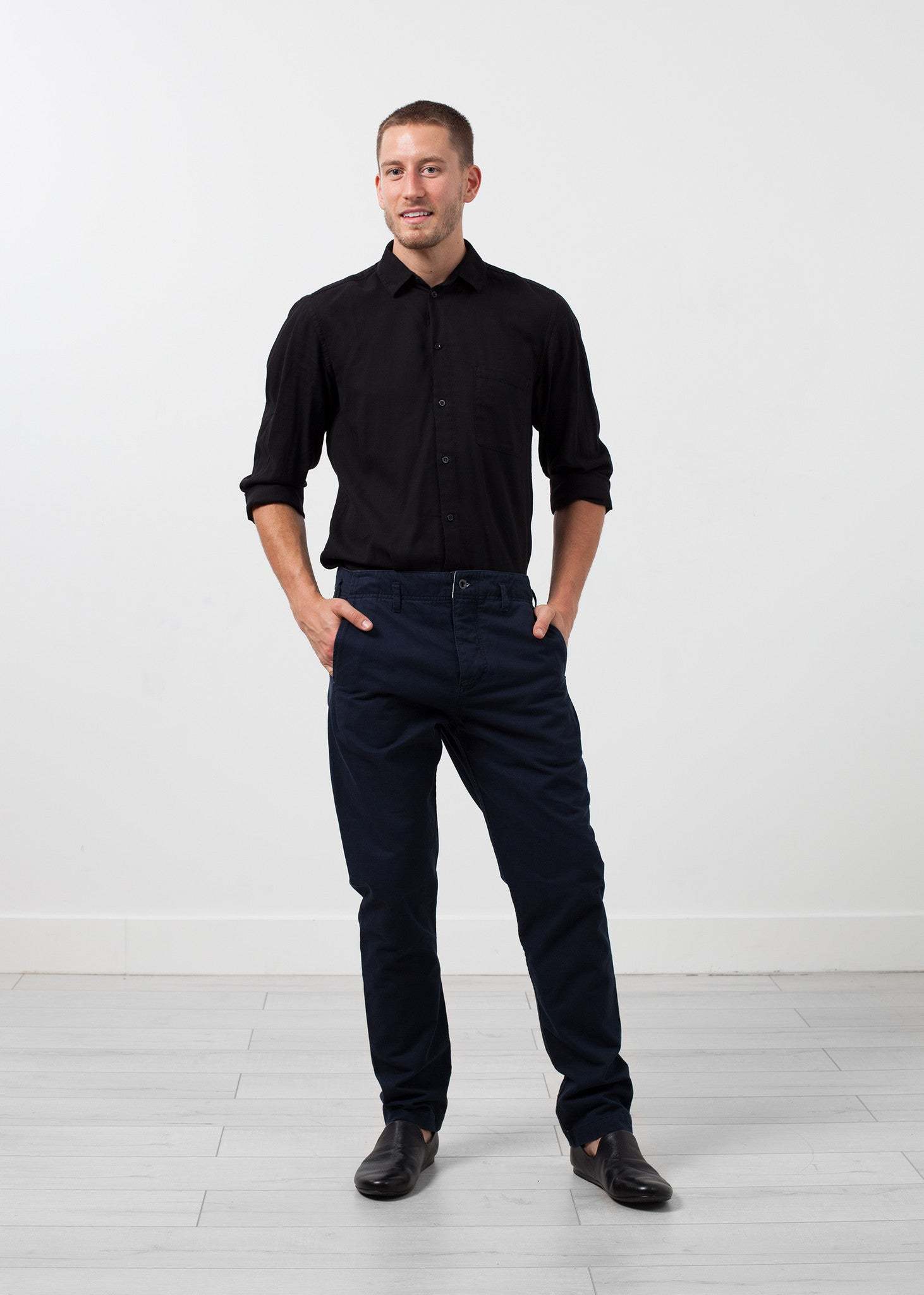 Hansen's Casual Trouser invites a straight legged pant to a skinny jeans ruling. Standout with this flattering fit of day to day wear. Four button fly closure. Four exterior pockets. 100% Cotton. Made in EU. Matt is wearing a size Medium. Matt is 6’2”, Chest 38”, Waist 31”, Inseam 34.5”.