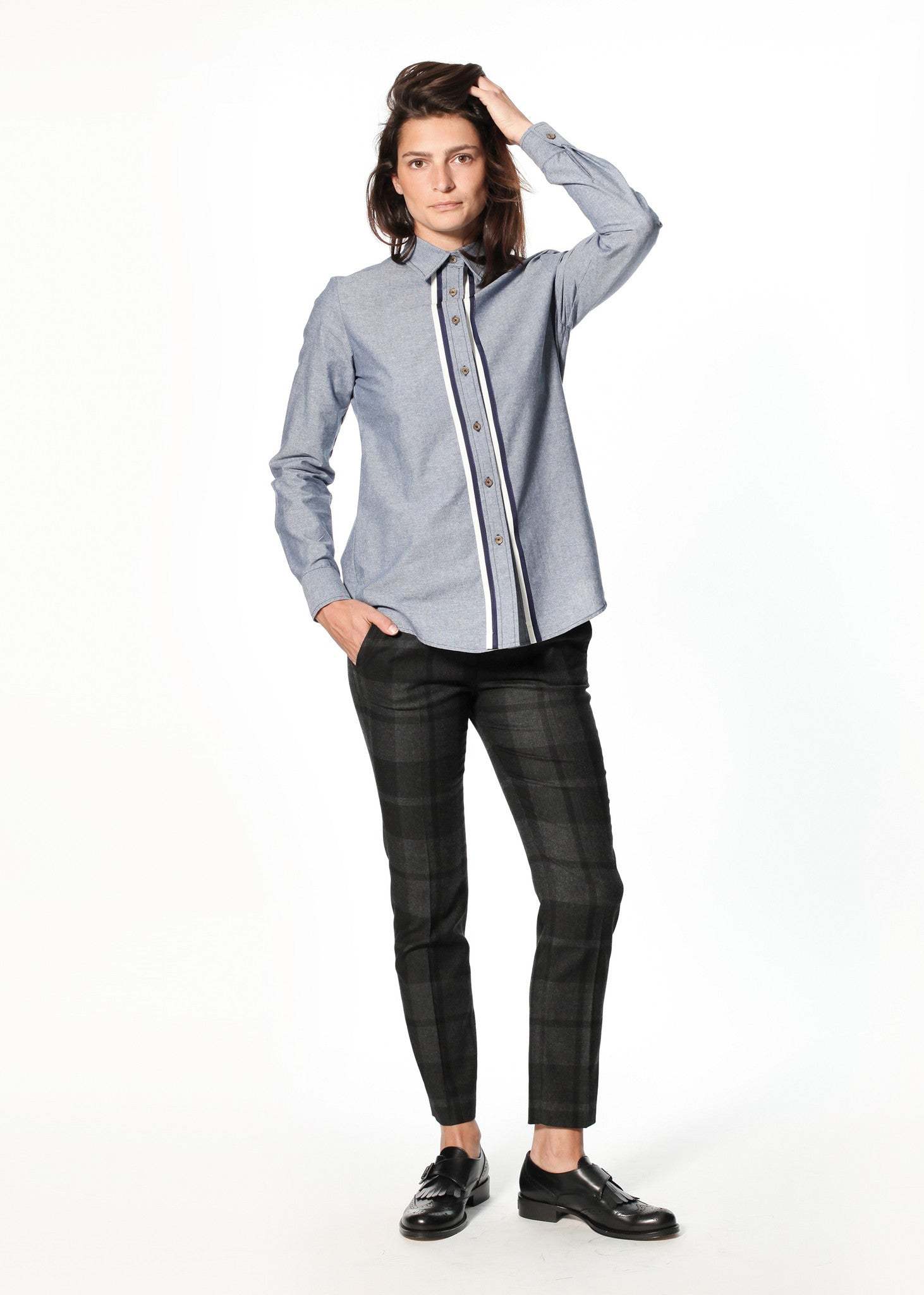 Happiness is a menswear-borrowed chambray shirt. A dashing cream and navy grosgrain ribbon lines the front placket. Back yoke traditional with an inverted pleat. Harvey Faircloth. Color Blue. 100% Cotton, Trim 100% Acetate. Made in U.S.A.