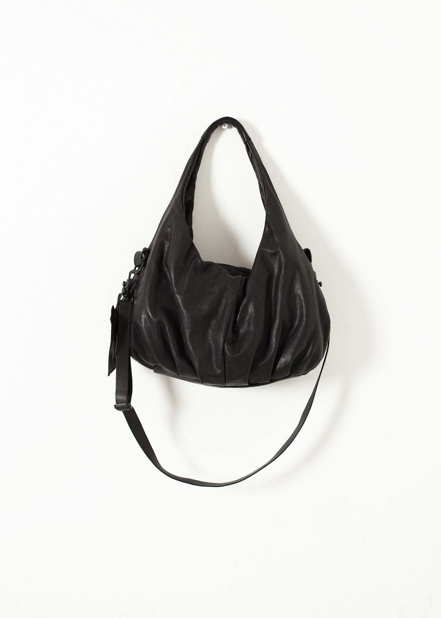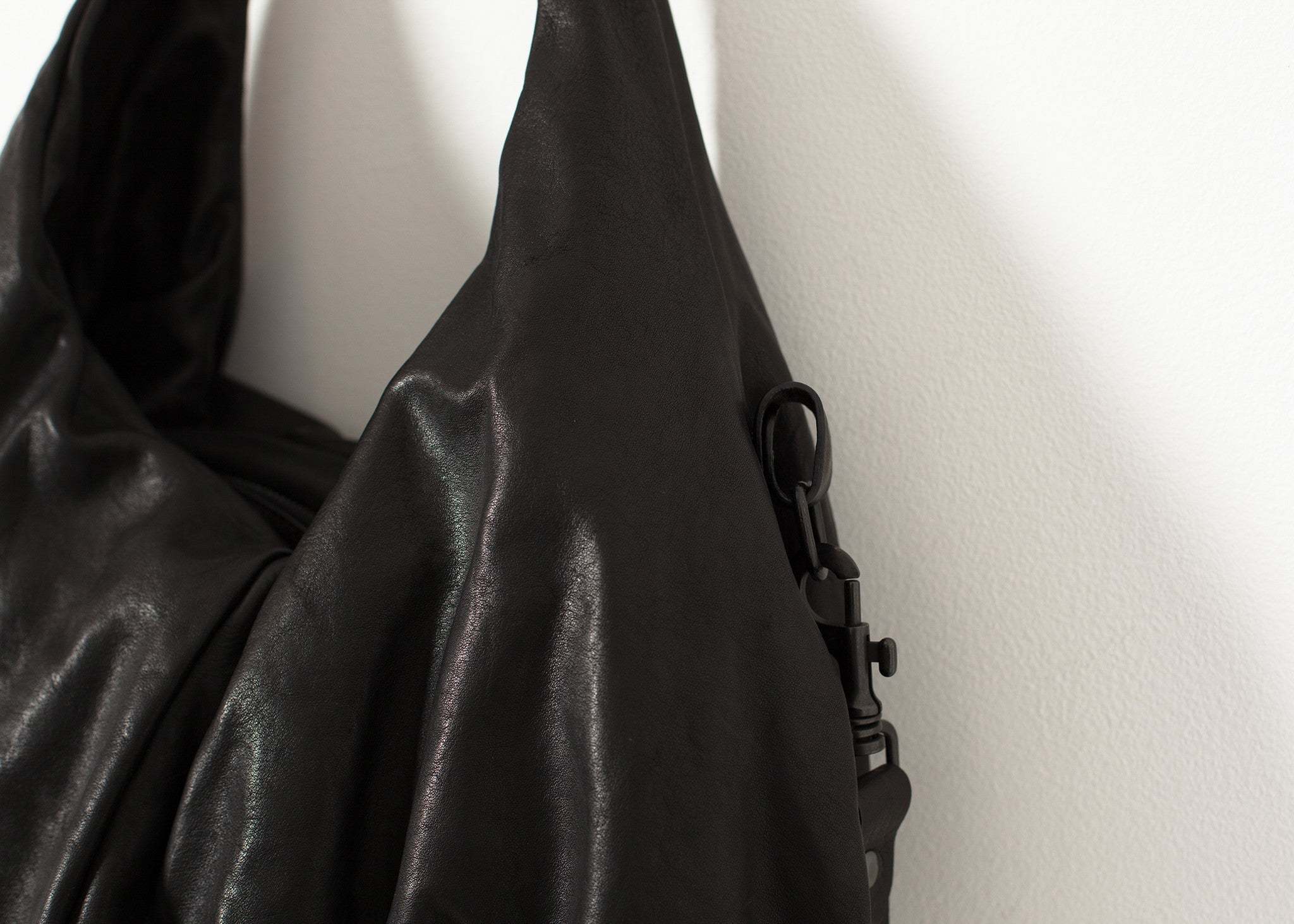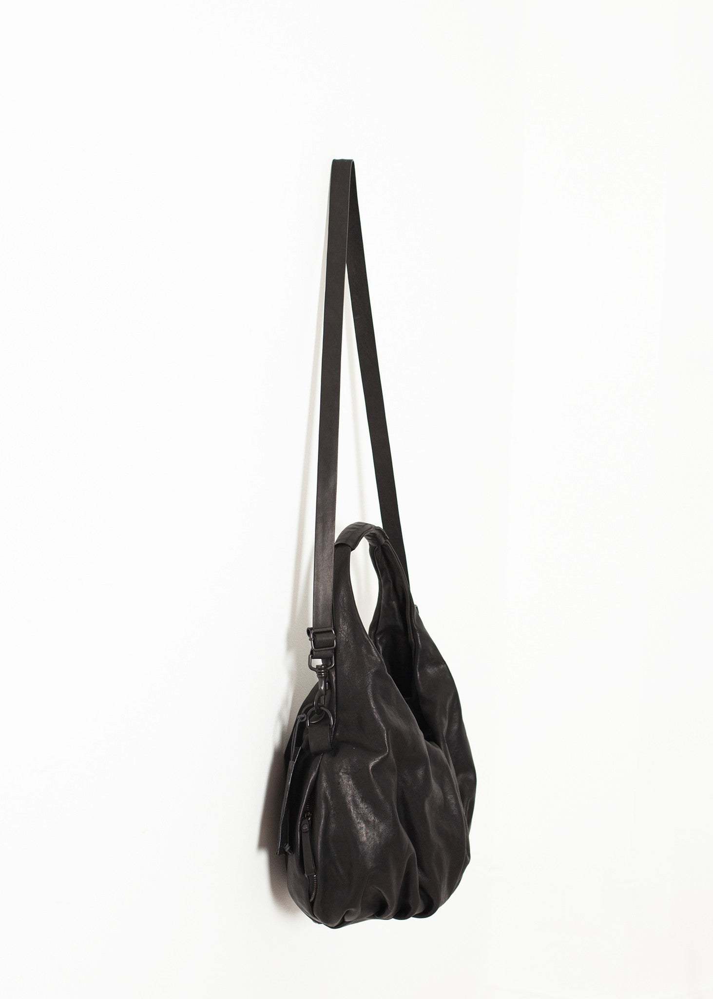 Married aesthetics of innovation and tradition, Marséll crafts leatherwear of mastering technique. Where modern classism takes wearable shape, anticipate artistic expression epitomized in leather footwear and bags. This enticing piece presents accessible artistry. Beautifully folded material is intoxicating to touch and see. Top zip for main closure. Two interior lining zip pockets. Two hidden side zip pockets. Adjustable strap with luggage tag. Color Black. 100% Leather, 100% Linen Lining. Made in Italy.