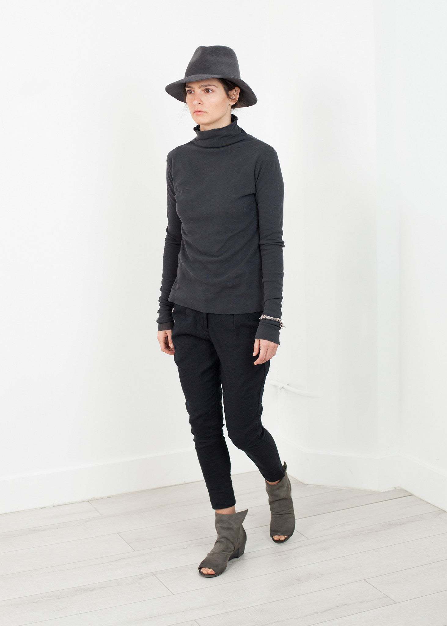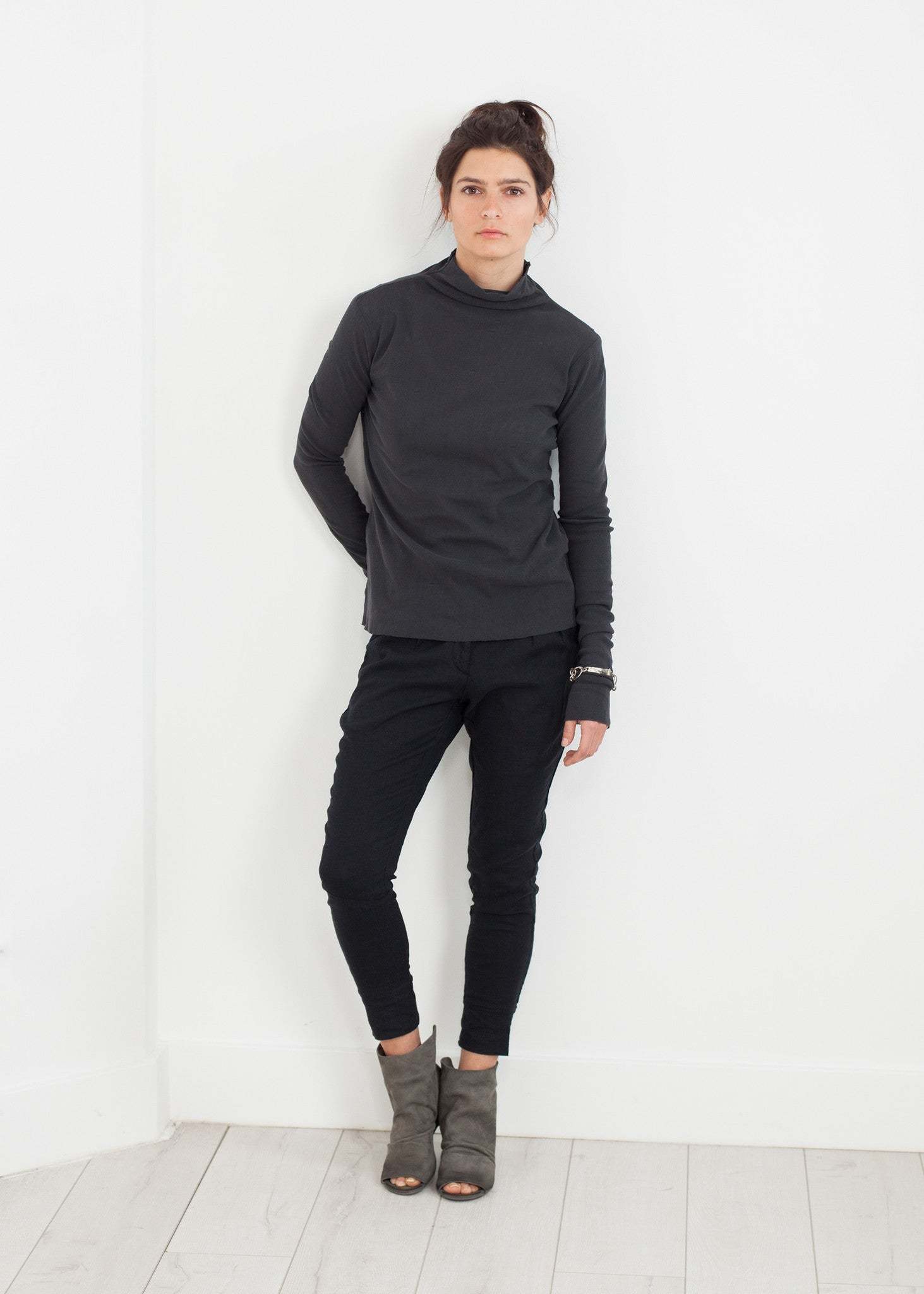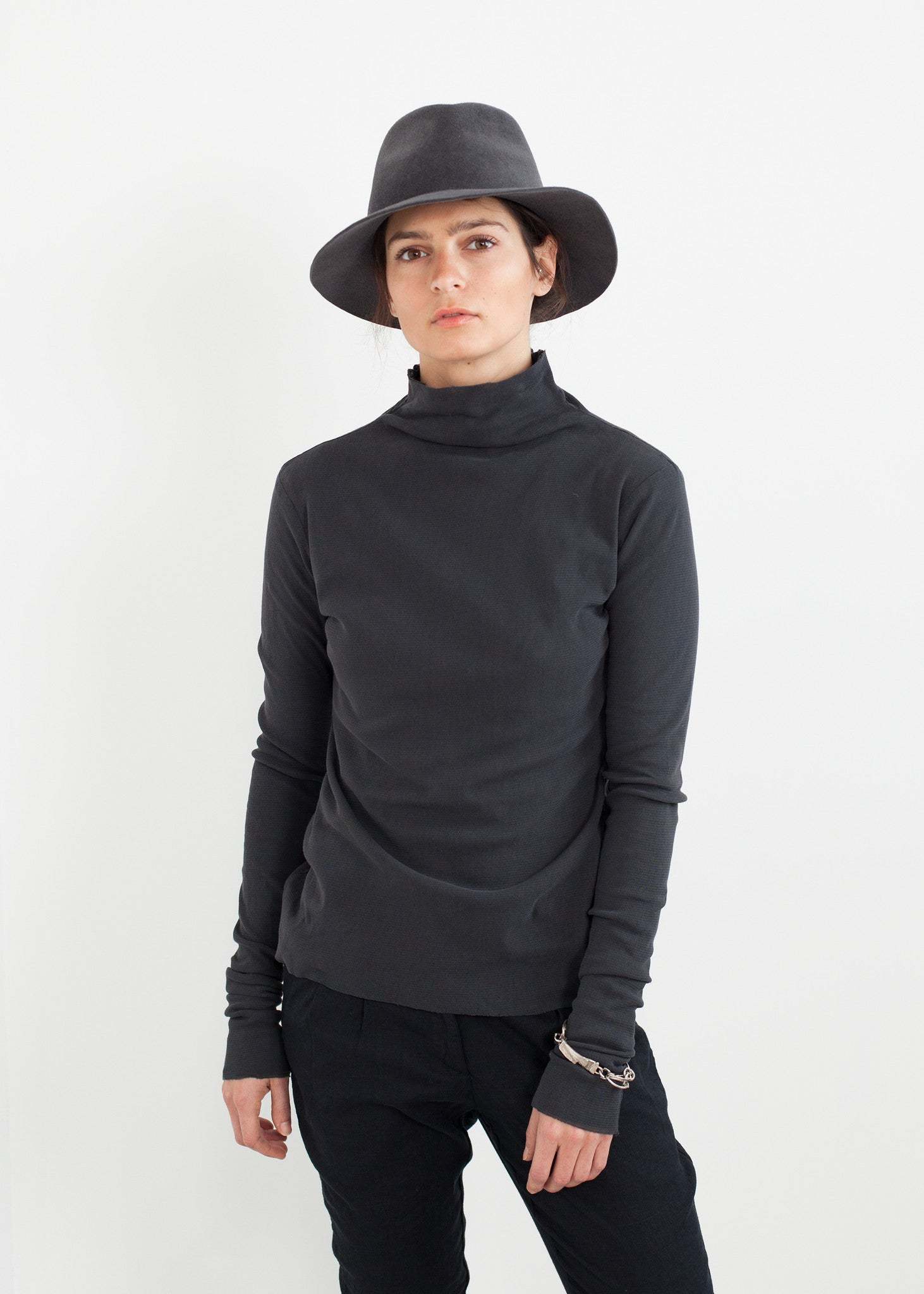 The Cotton Long Tee from Pip-Squeak Chapeau is not one's standard basic. Layered gauze renders the texture notable while not revealing. Raw edges caress this turtleneck. Color Ink. 100% Cotton Gauze. Made in U.S.A. Lana is wearing a Small.