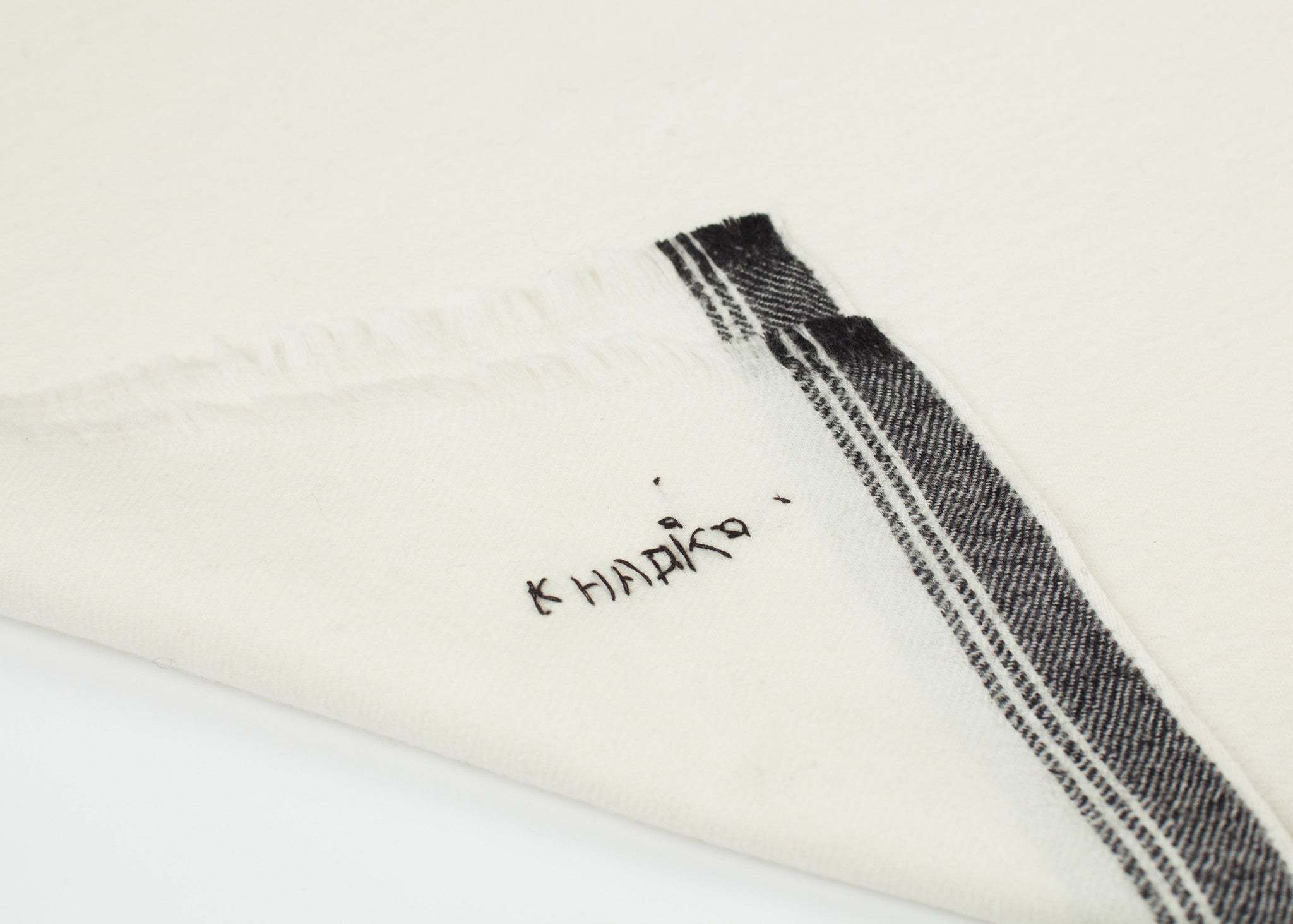 Neutral toned and loosely woven, this wool scarf has contrast edging in a subtle charcoal and feels as luxurious as it is warm. Khadi & Co. is named after Muhatma Gahndi's Khadi movement bringing independence to the people of India through the growth of the cotton industry. Color Off White. 100% Wool. Made in India.