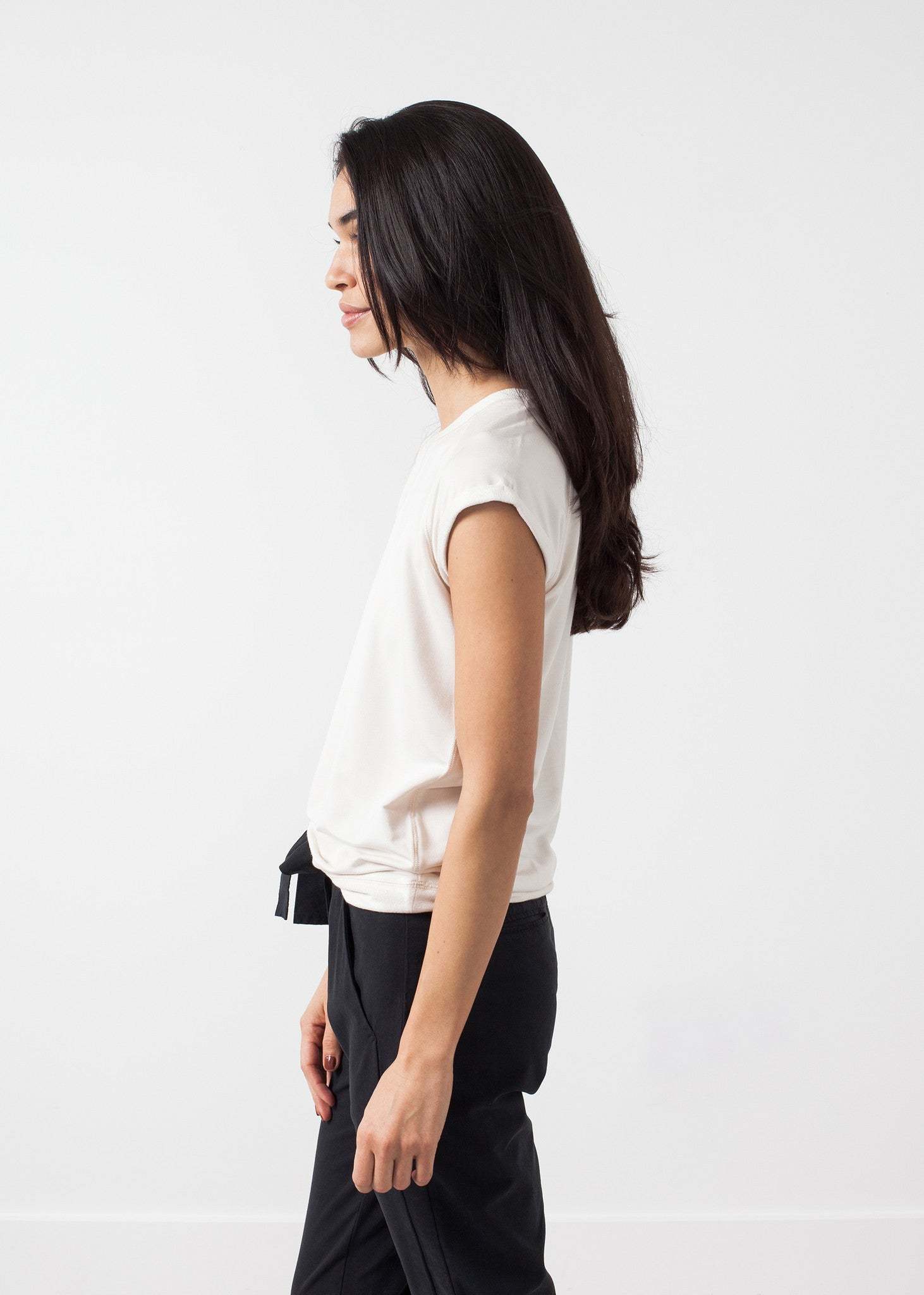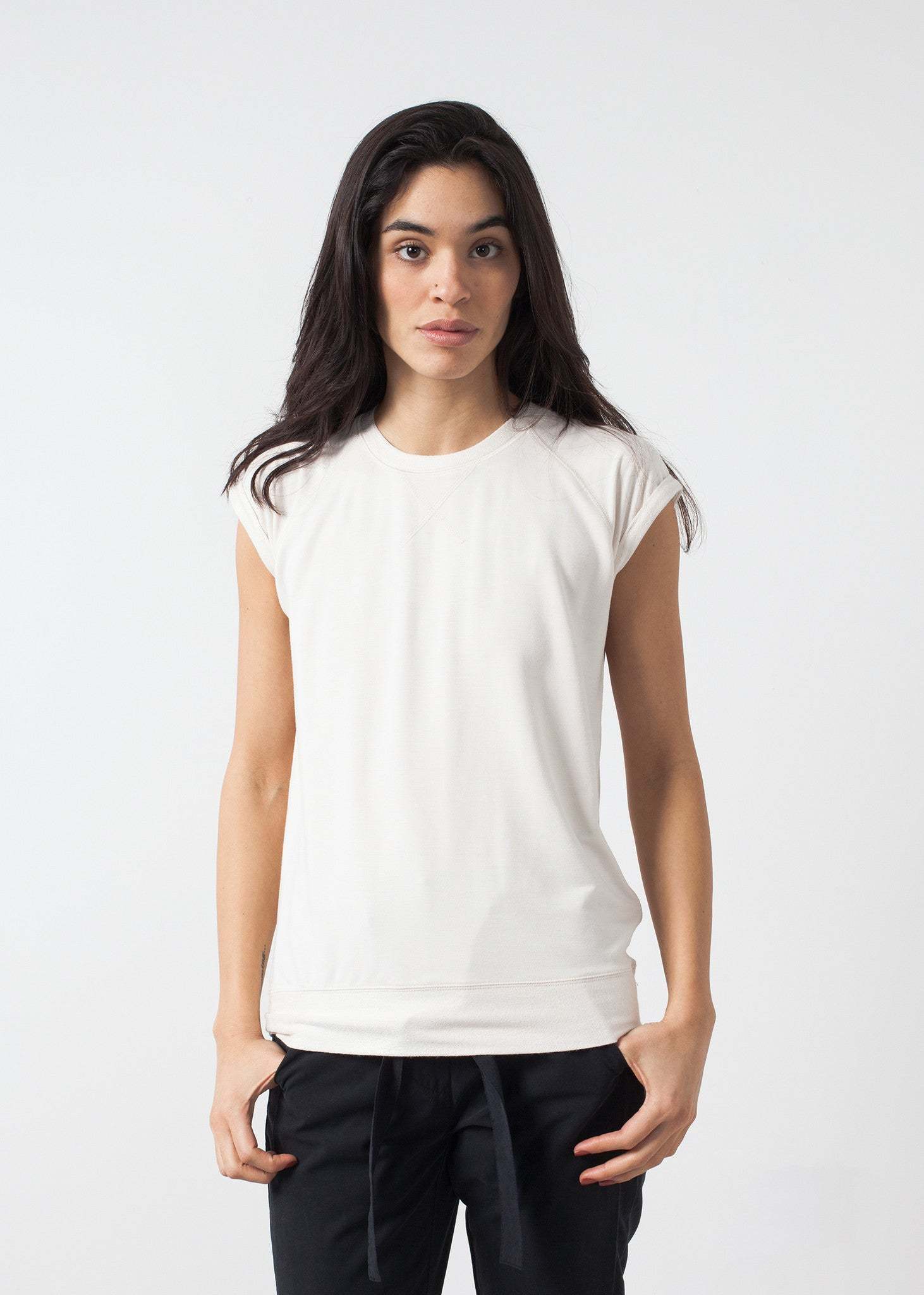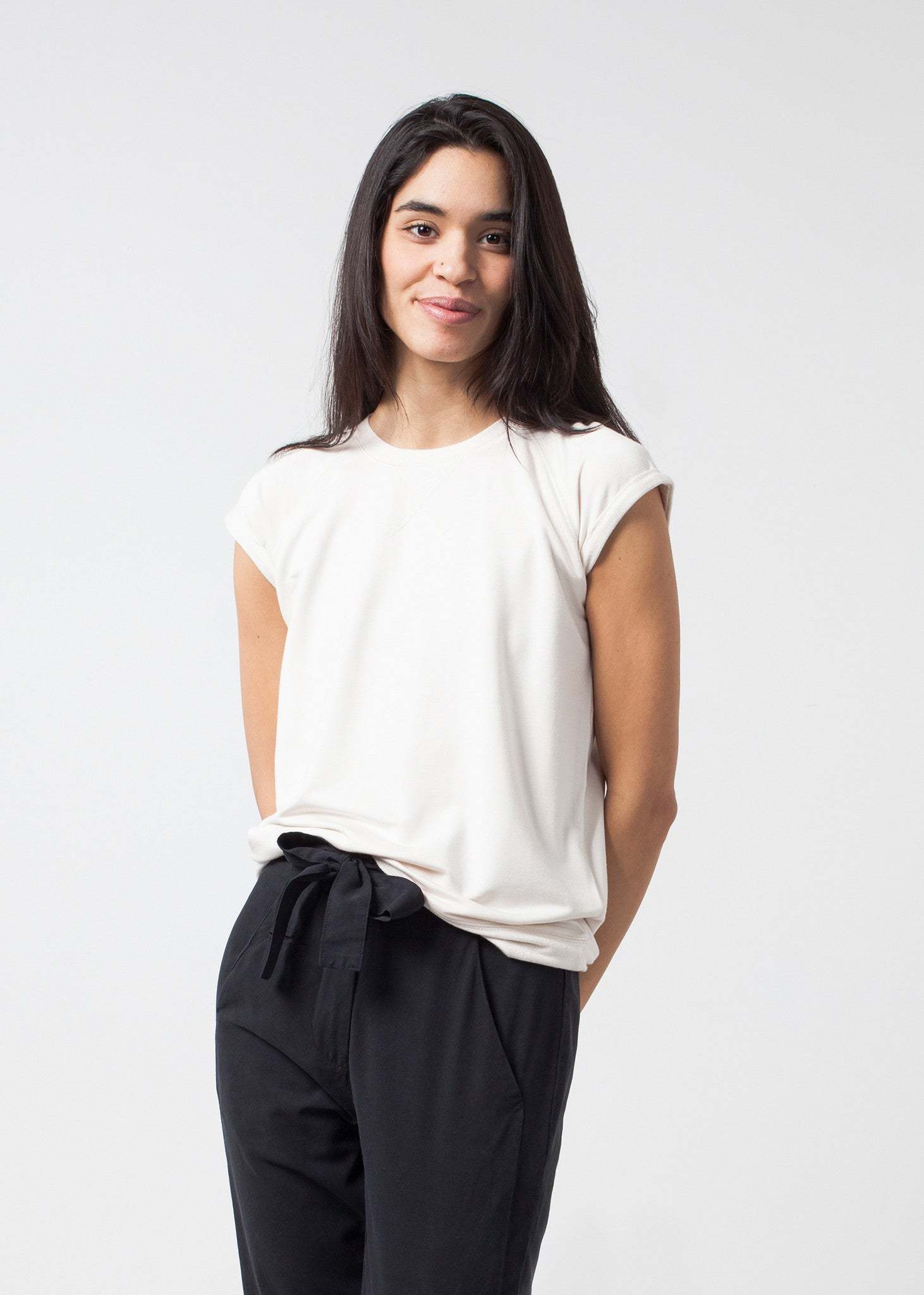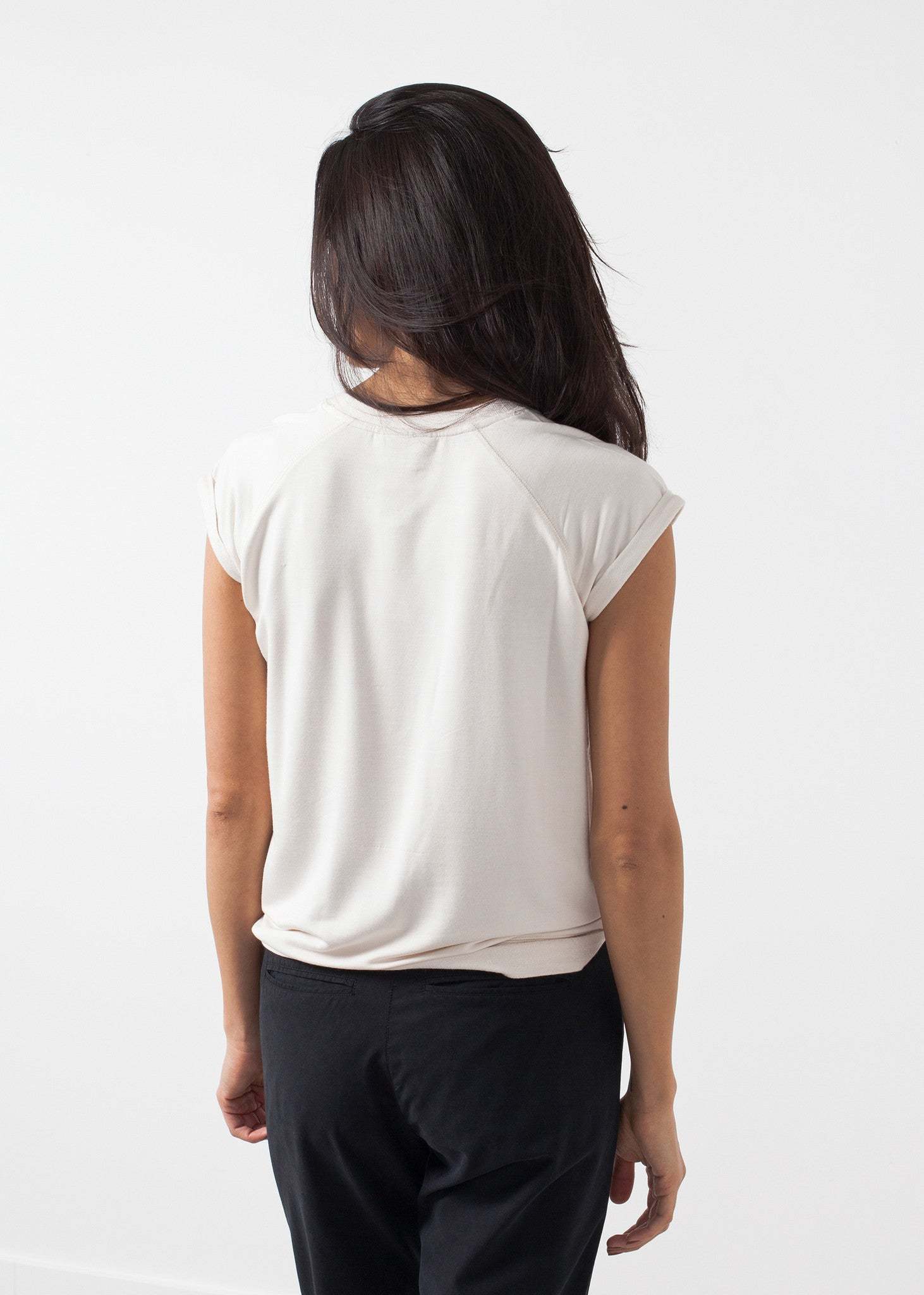The comfort factor of the Fani Top from Malene Birger is unmistakable; cloud-like heaven. Crew neck with contrast sleeves and hems. Raglan sleeves. Color Cream. 95% Viscose, 5% Elastane. Ashley is wearing an X Small.