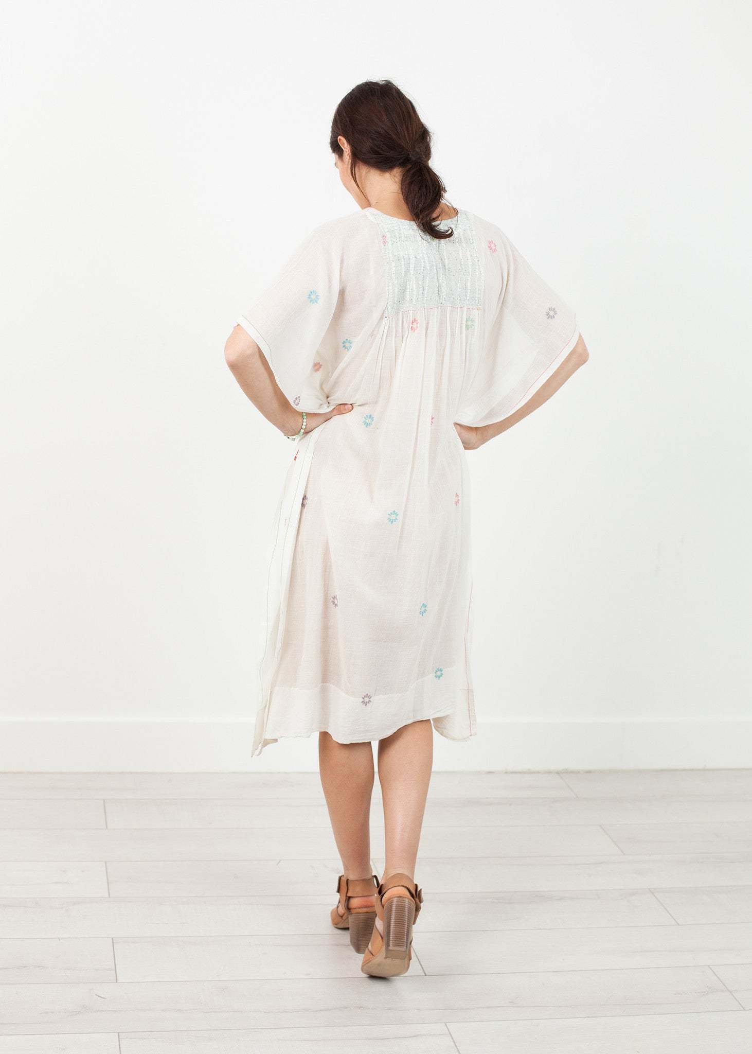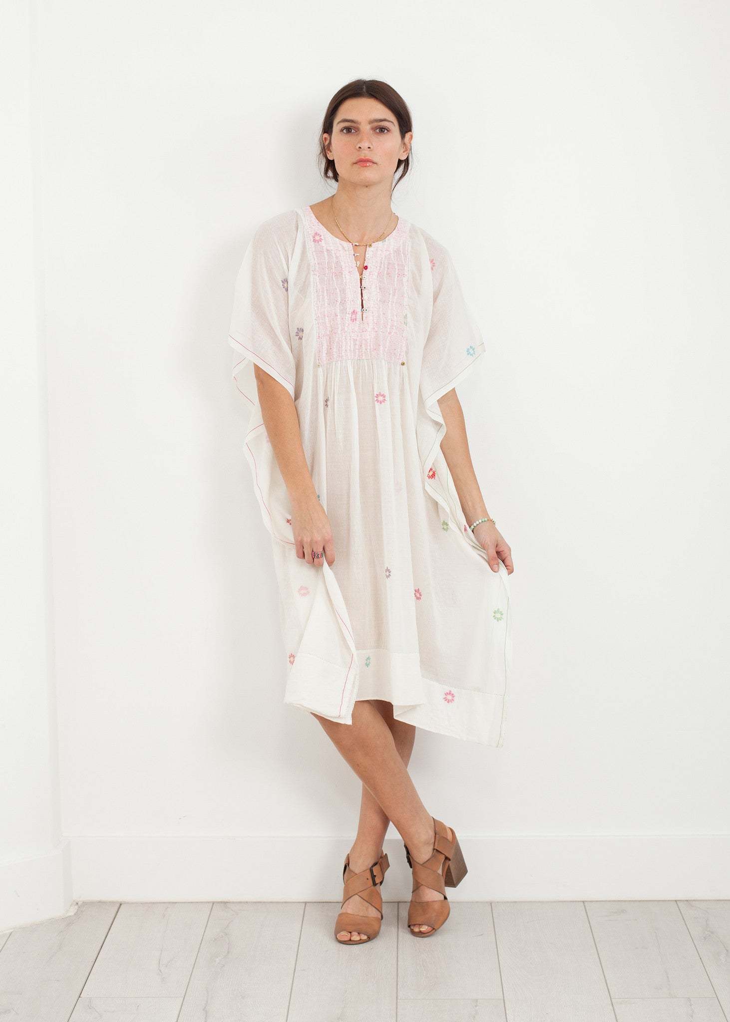 This tunic dress provides just enough color to hint warmer temperatures while remaining universally seasonless. Intricate gathers throughout adds to the piece's eclecticism. Completely handmade, stitched, and embroidered. Short sleeves with side slits and a loose silhouette. Single button placket opening. Hits knee-length. Wide hem. Pero. Color White. 100% Cotton. Made in India.Â ï»żLana is wearing a size 38.