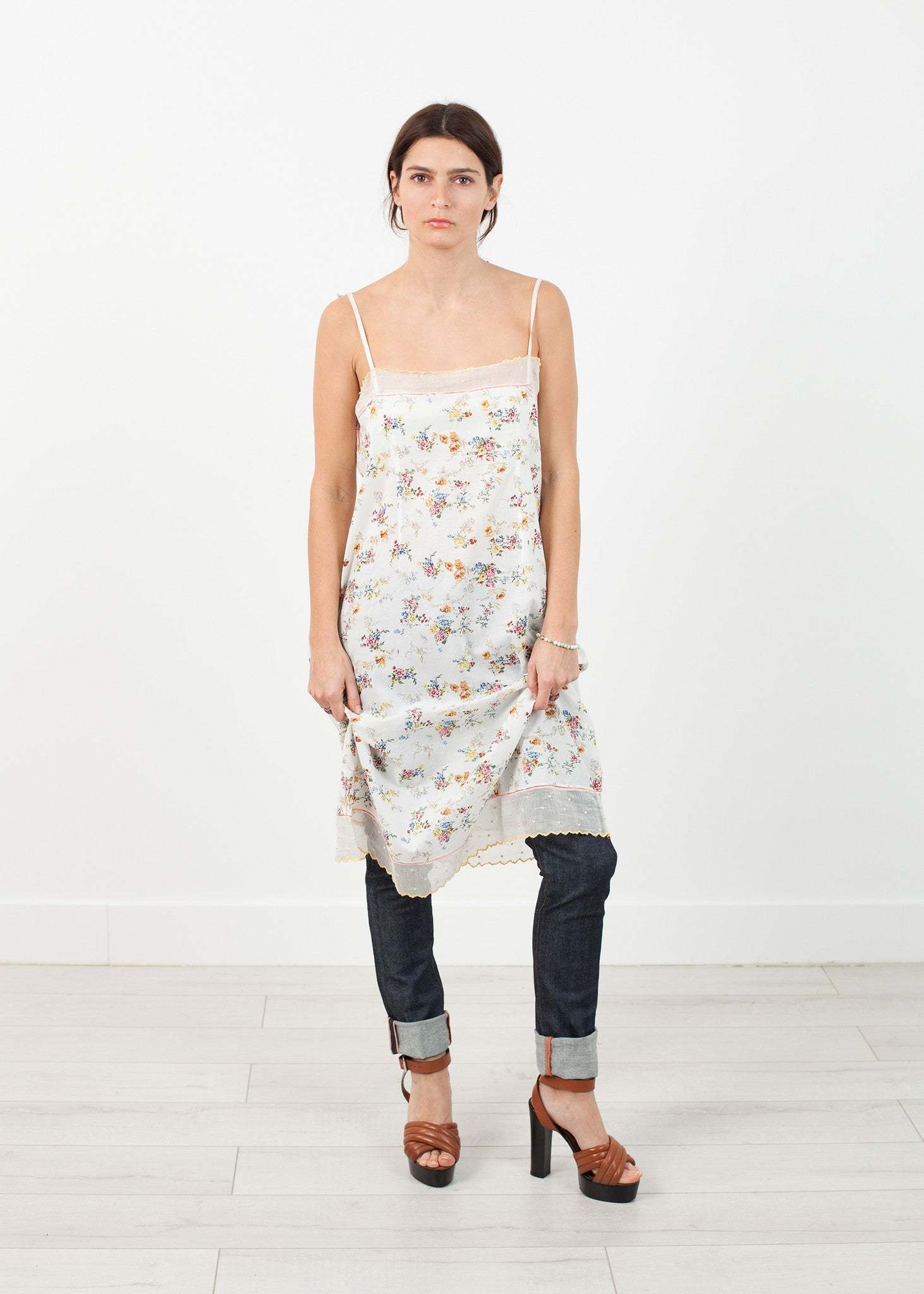 This dress provides just enough color to hint warmer temperatures while remaining universally seasonless. Beautifully printed flora throughout. Completely handmade, stitched, and embroidered. A natural, loose silhouette. Slim straps, and hits just below the knee in length. Sweet ruffled hem. Pero. Color Floral. 100% Cotton. Made in India. Lana is wearing a size 36.