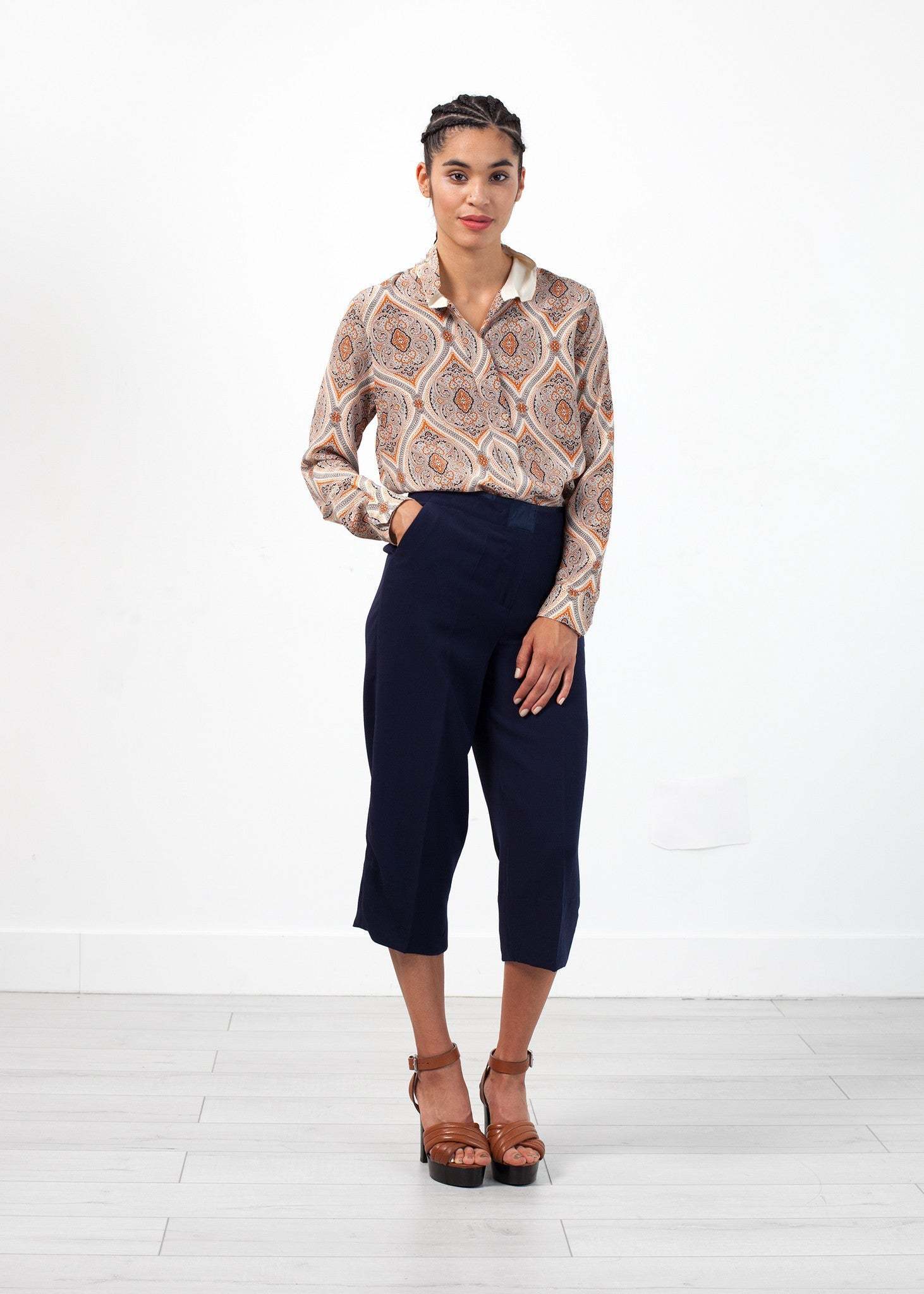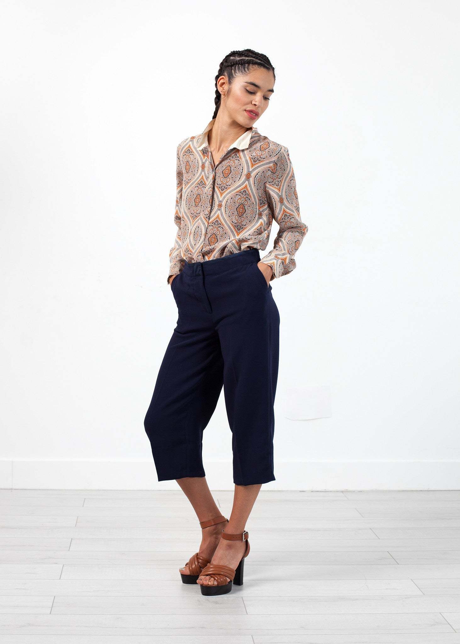 Cropped in length with a chic finish, the Giulias Pant offers a business look with vast versatility. Hook and eye closure with zip fly. Two exterior pockets. By Malene Birger. Permanent press. Color Blue. 100% Polyester, 100% Silk trim. Made in China. Ashley is wearing a European 34.