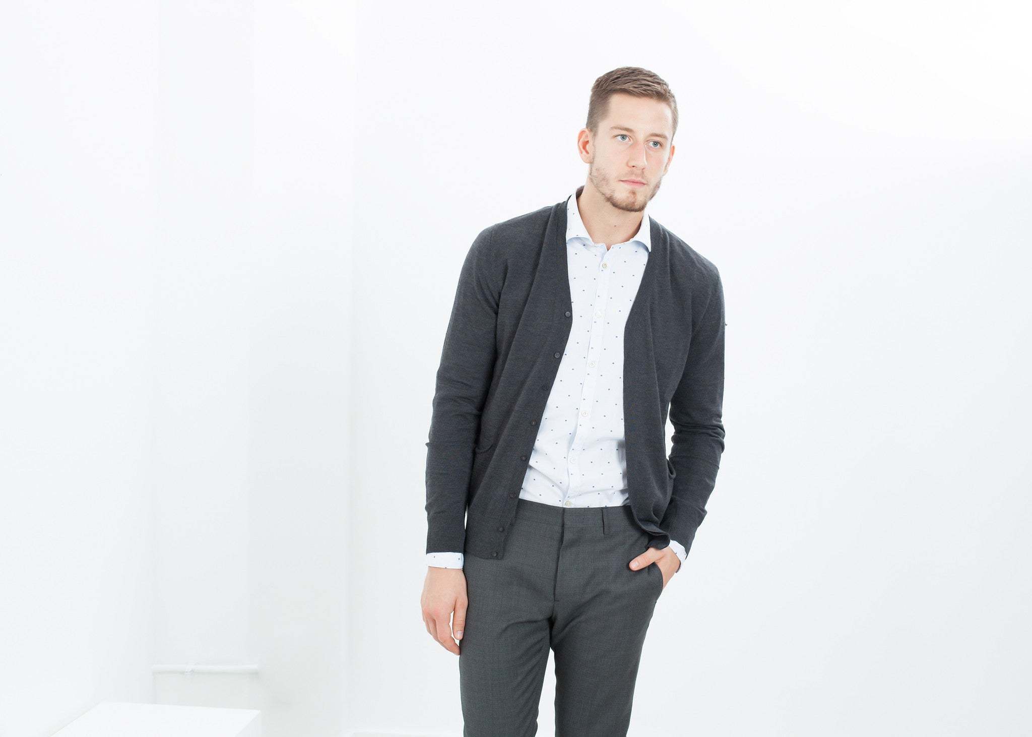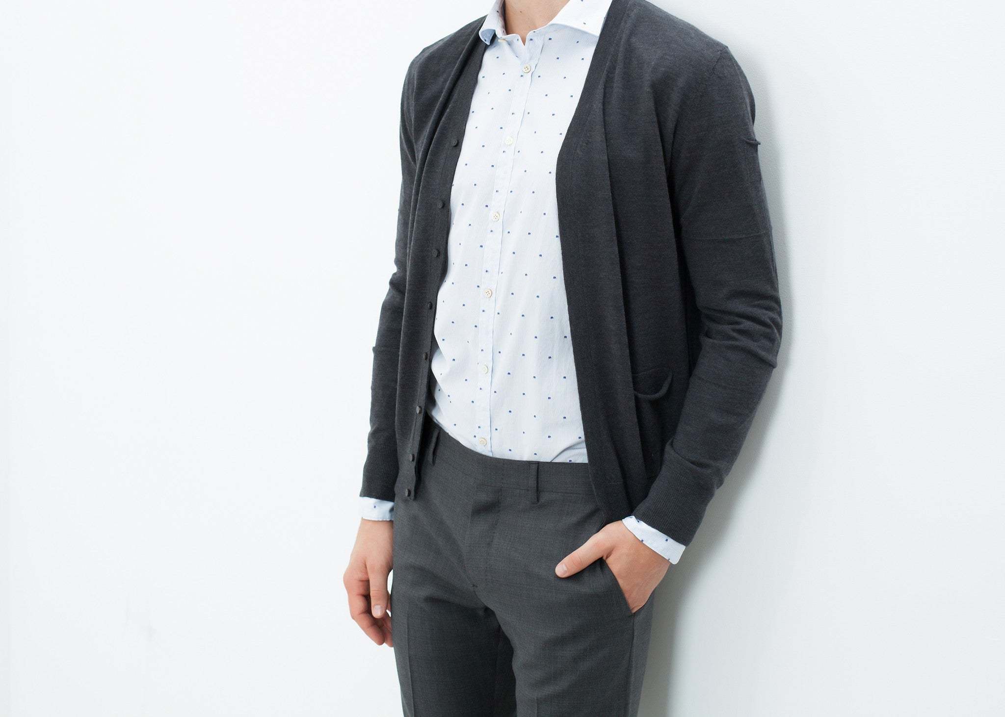 A merino wool cardigan in classic shape and length. A hidden button placket creates a clean line and the two patch pockets have a refined curl to the knit edge. Isabel Benenato. Color Charcoal. 100% Extrafine Merino Wool. Matt is wearing a size Medium.Β Matt is 6β2β, Chest 38β, Waist 31β, Inseam 34.5β.