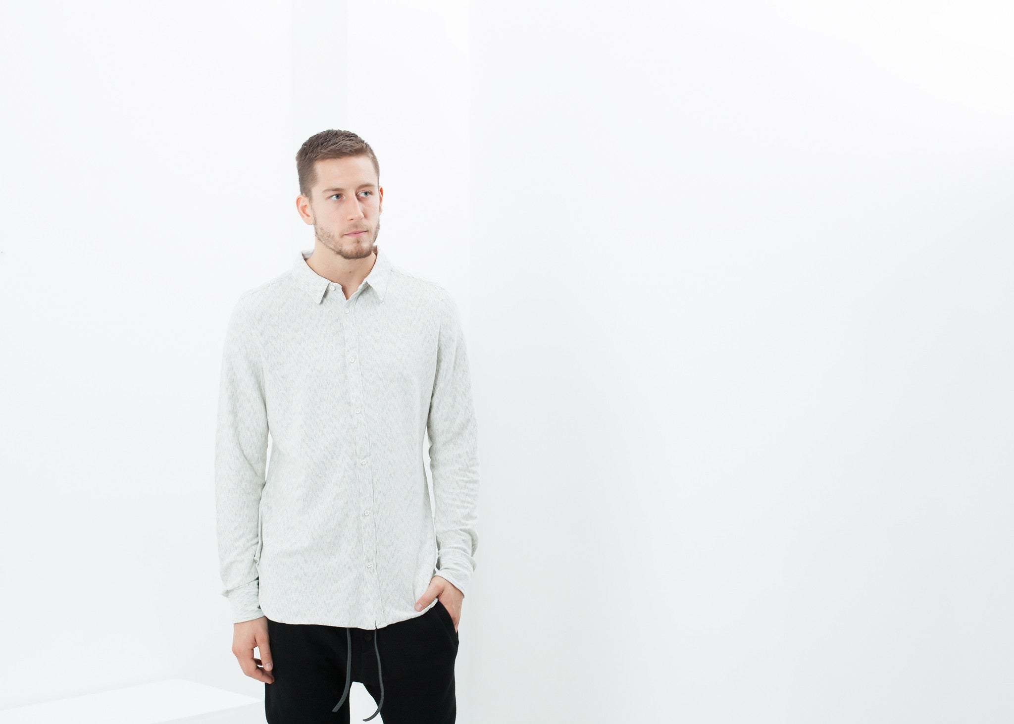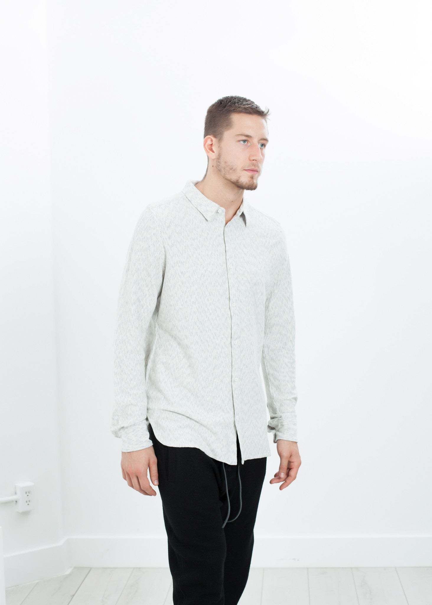 V:Room takes the classic button up and plays it casual by giving it a contrasting fabric inside. Curved hem with side splits. Color Ivory/Black. 100% Cotton. Matt is wearing a size Large. Matt is 6’2”, Chest 38”, Waist 31”, Inseam 34.5”.