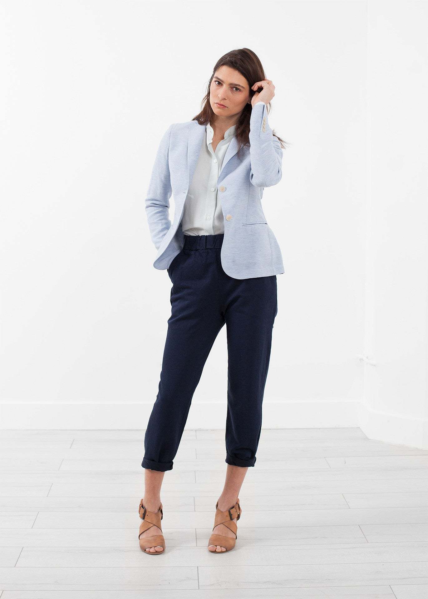 The Lavanda Blazer is an excellent springtime basic with its trim silhouette and soft color scheme. Two button placket closure at front. Two exterior pockets at front. Lining. Lardini. Color Blue. 38% Flax, 32% Viscose, 30% Cotton, Lining 70% Acetate, 30% P.B. Elite. Made in Italy. Lana is wearing the Italian 38.